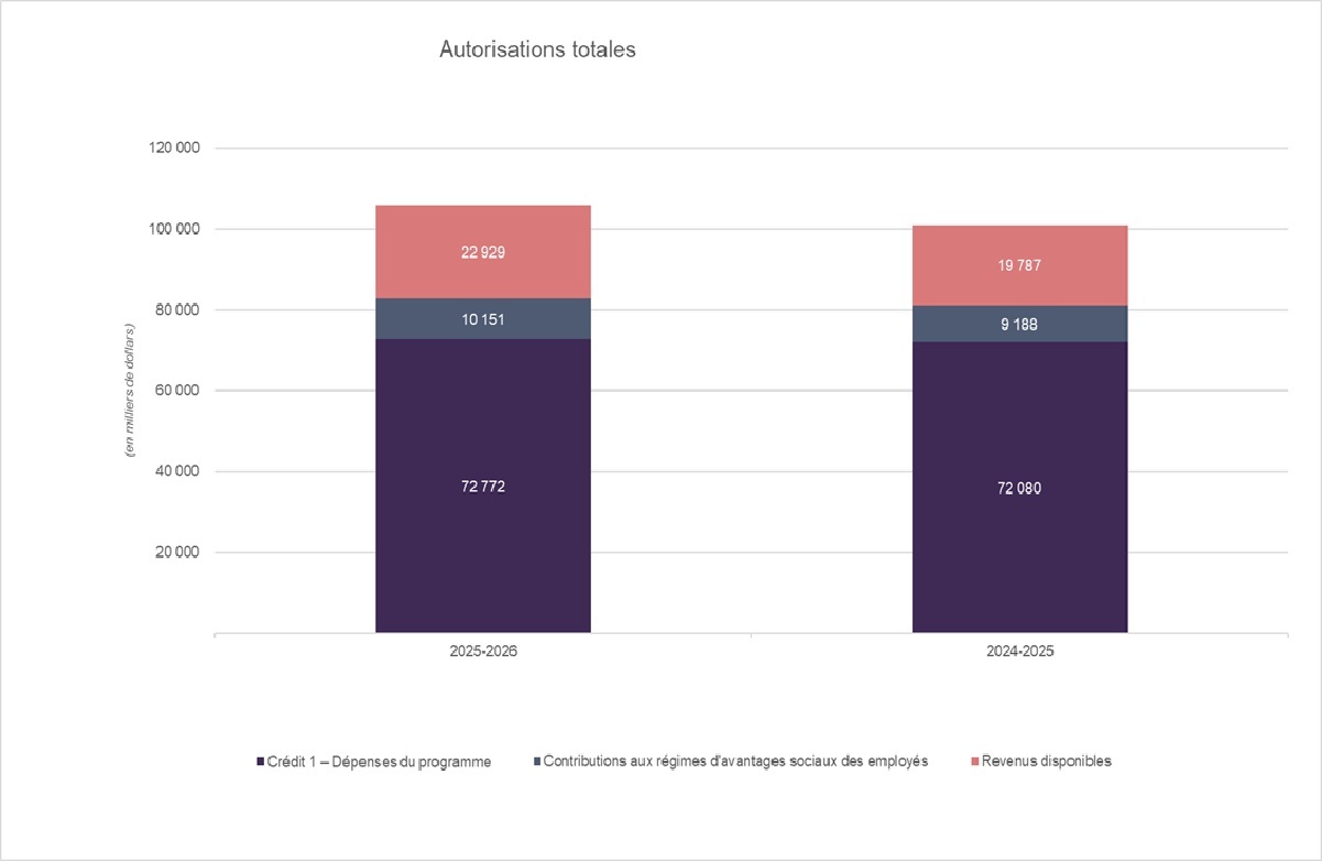 Le total des autorisations disponibles pour 2025‑2026 a augmenté de 4,9 millions de dollars ou 4.8 % par rapport aux 101,0 millions de dollars disponibles pour l'exercice 2024‑2025. L'écart est principalement attribuable à une augmentation de 0,7 million de dollars de crédit voté, 4,5 millions de dollars en autorisations législatives liés aux revenus disponibles, 1,0 million de dollars pour les régimes d'avantages sociaux des employés et de 3,4 millions de dollars de revenus reportés de l'exercice précédent. Ceci est compensé par une réduction de 4,7 millions de dollars liée aux retards dans la perception des revenus disponibles, car tous les ministères ont été touchés par la dissolution du Parlement.