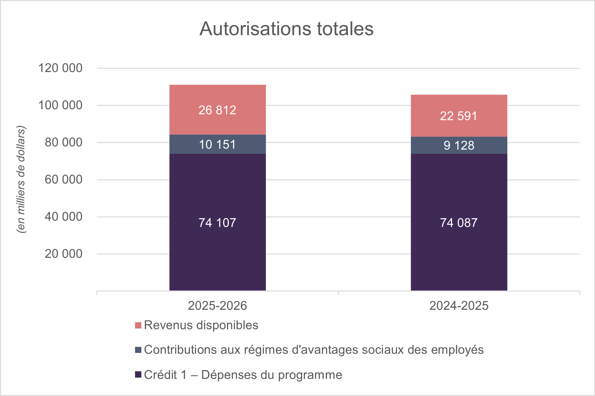 Le total des autorisations disponibles pour 2025-2026 a augmenté de 5,3 millions de dollars ou 5% par rapport aux 105,8 millions de dollars disponibles pour l'exercice 2024-2025. L'écart est principalement attribuable à une augmentation de 0,9 millions de dollars en autorisations législatives liés aux revenus disponibles, 1,0 million de dollars pour les régimes d'avantages sociaux des employés et de 3,4 millions de dollars de revenus reportés de l'exercice précédent.