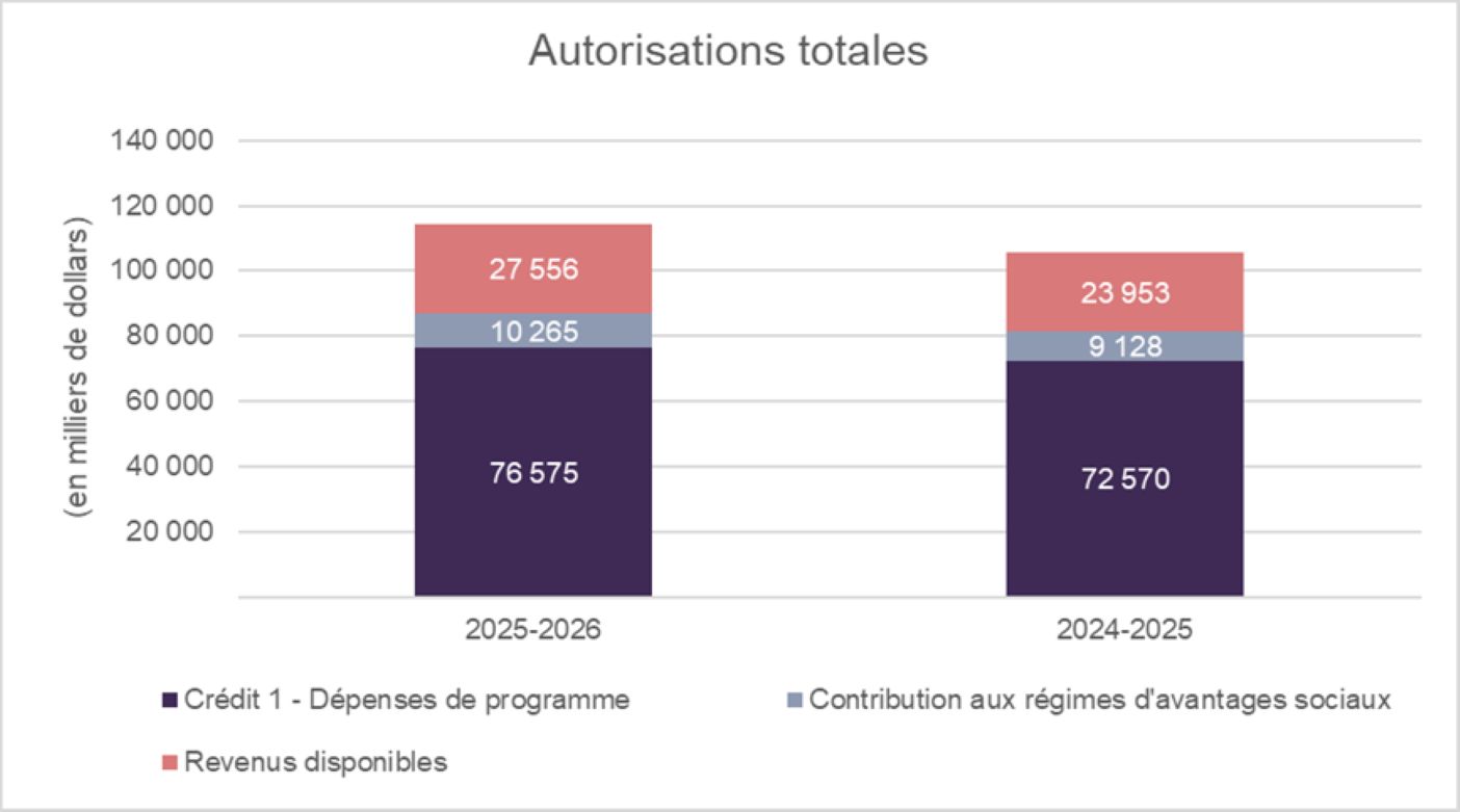 Le total des autorisations disponibles pour 2025-2026 a augmenté de 8,7 millions ou 8,3% par rapport aux 105,7 millions disponibles pour l'exercice 2024-2025. L'écart est principalement attribuable à une augmentation de 3,7 millions en autorisations législatives liées aux revenus disponibles, 1,7 million pour le programme de perfectionnement en appui aux leaders noirs, 1,4 million pour le report de fonds lié au Programme de leadership avancé, 1,1 million pour les régimes d'avantages sociaux des employés, et 0,8 million pour la Stratégie canadienne en matière de justice pour les personnes noires.