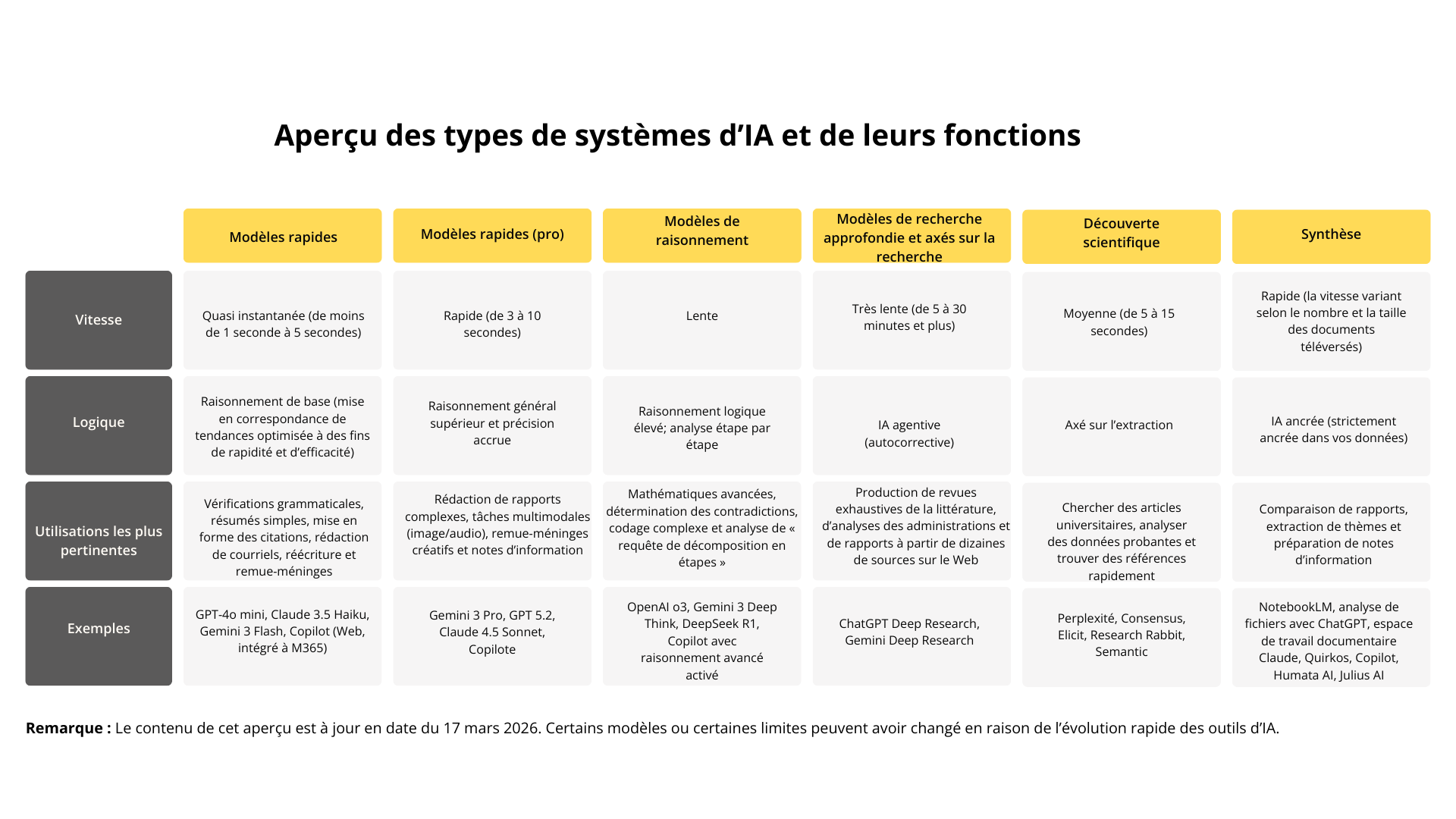 - Les modèles axés sur la recherche et les modèles de recherche approfondie aident à trouver et à synthétiser l'information provenant de plusieurs sources.