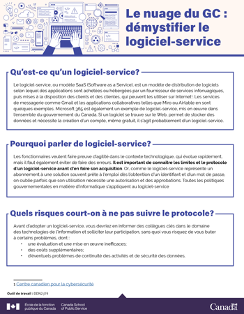 Les fonctionnaires veulent faire preuve d'agilité dans le contexte technologique, qui évolue rapidement, mais il faut également éviter de faire des erreurs. Il est important de connaître les limites et le protocole d'un logiciel-service avant d'en faire son acquisition. Or, comme le logiciel-service représente un abonnement à une solution souvent prête à l'emploi dès l'obtention d'un identifiant et d'un mot de passe, on oublie parfois que son utilisation nécessite une autorisation et des approbations. Toutes les politiques gouvernementales en matière d'informatique s'appliquent au logiciel-service.
